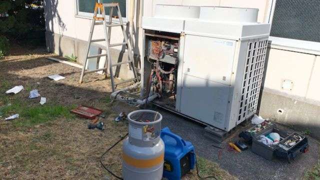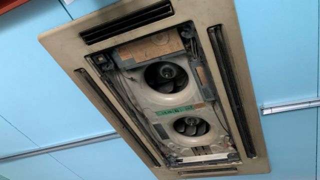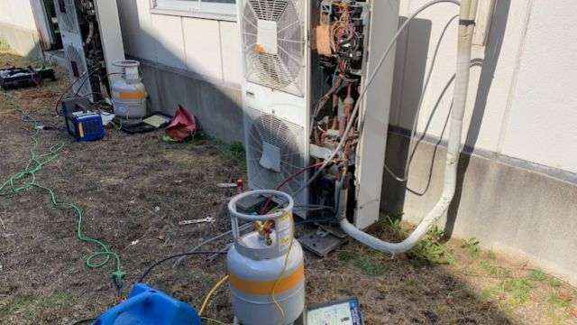 大阪府貝塚市㊙酒卸売業者様から店舗閉店のためフロンガス回収に伴った空調機の完全処分のご依頼です。エアコンは全部で4基。その内の1基はツインで、室内機4基、室外機3基、とても年季のはいったエアコンでした。よく頑張ってくれたと思います。お疲れさまでした。