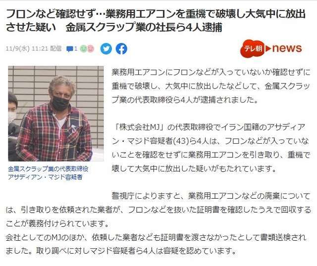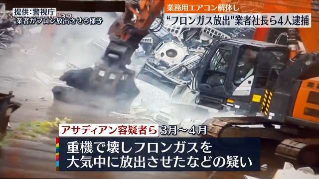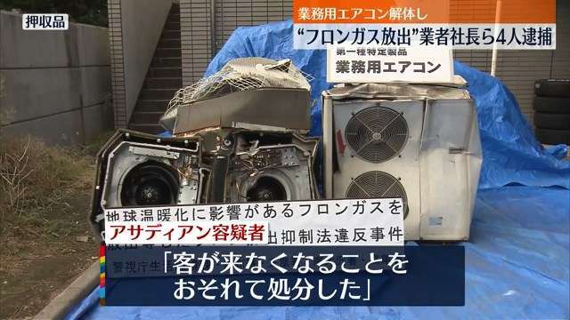 地球温暖化につながる「フロン類」のガスが充塡された状態の業務用エアコンを違法に解体して大気中にガスを排出したなどとして解体業者がフロン排出抑制法違反の疑いで逮捕したとの事件がありました。フロン類が冷媒として充塡されているかを確認せず、重機で解体してガスを大気中に放出。機器管理者、建設・解体業者、廃棄物・リサイクル業者、冷媒機器の廃棄する際の規制が強化されているのにもかかわらず「違法とわかっていたが…」理由にはなりません。安さをウリにしている悪質業者も少なくはありませんのでフロンガス回収にお困りの際は弊社までどうぞお気軽にご相談ください。