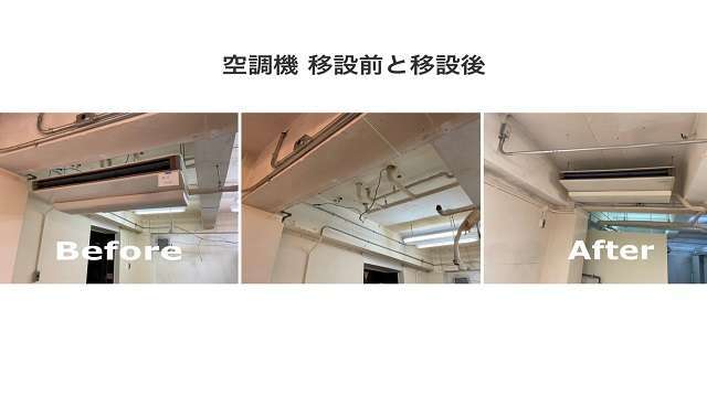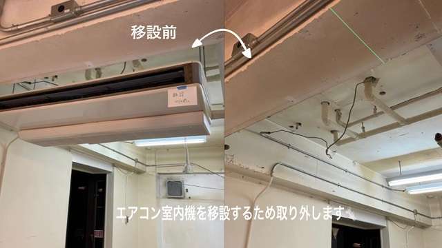 フロアに取り付けられている空調機ですがパネル組立の障害になるのでオーナー様の許可のもと現在位置から移動するのでいったん取り外します🔩