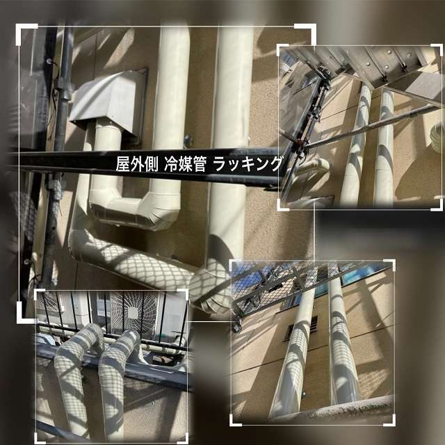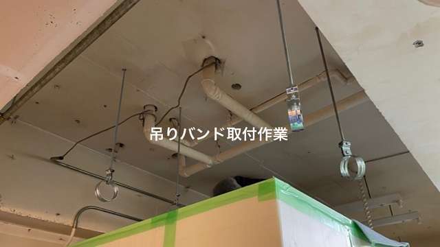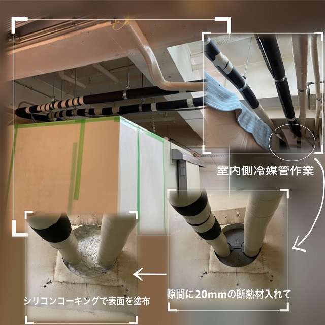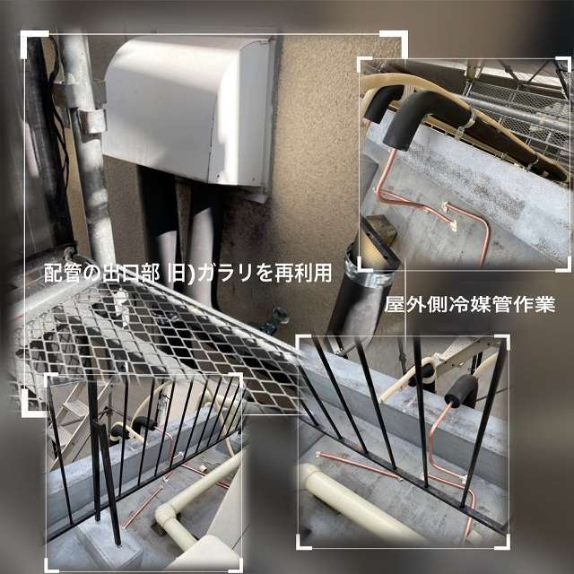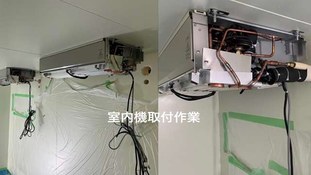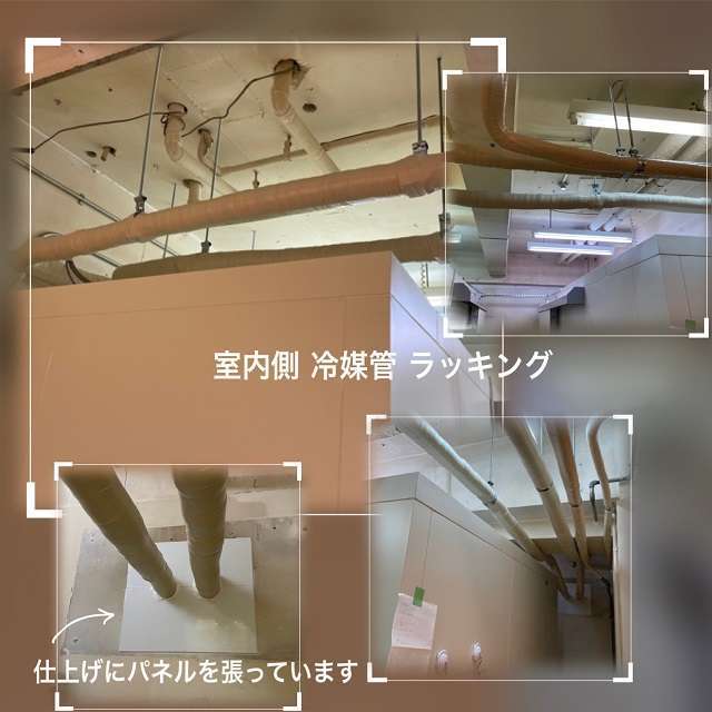 まず冷媒管の貫通部としてここの換気扇を利用します🔧配管経路を確保したうえで吊りバンドを取り付けて🔩室内機取付作業と室外機設置作業と同時に室内側と室外側の冷媒管接続作業に取りかかります🔧