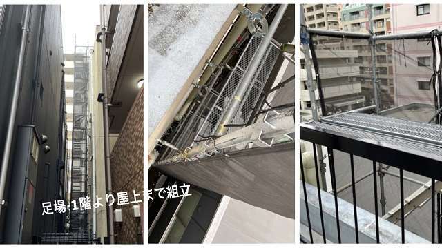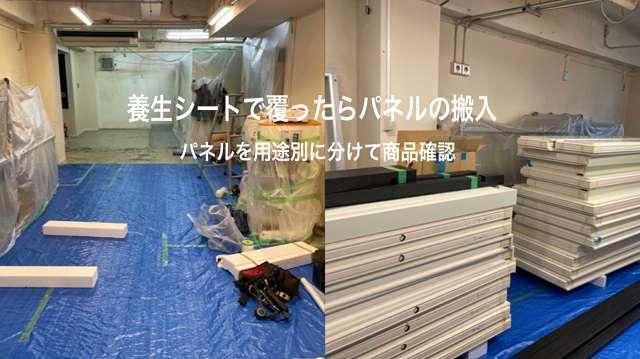 壁側が背になるので足場を組立てたら養生作業です。正直😢時間かかるしめんどくさい作業ではありますが😖現場の始まりは養生作業からです。工事範囲以外の部分が汚れたり破損したりしないよう保護していくとても大事な重要工程です😉みっちりと養生したあとはパネルを用途別に搬入していきます👍