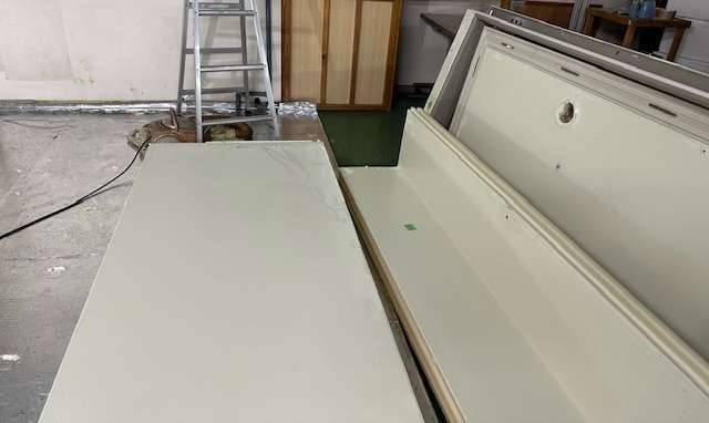 ドアを外し、天井パネルの接合部のコーキングをカッター等で綺麗に除法した後、角から順にパネルを外す。床パネル、フレーム(架台)を撤去する。