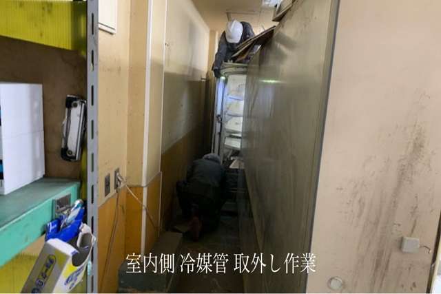 ショーケースは➋基、冷凍機別置型なので冷凍機からショーケースを接続する冷媒管。ガスを回収したあと撤去に取り掛かります🔧新しい機器の設置、配管の接続や配線工事をふまえ➋日間の作業期間をいただきました٩(ˊᗜˋ*)و