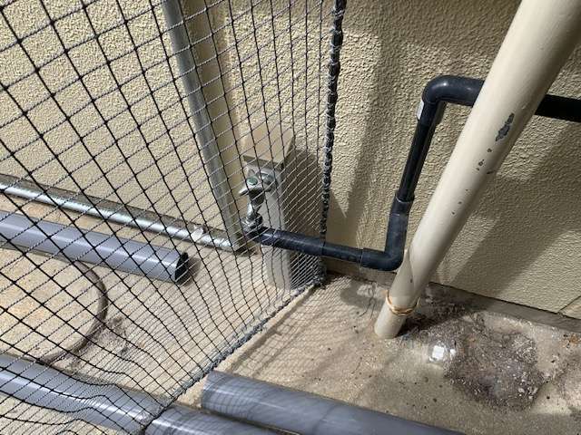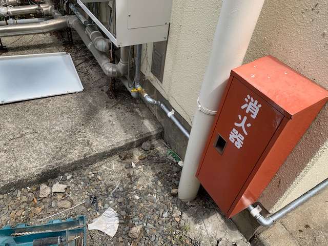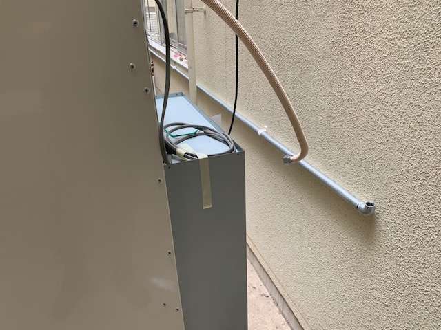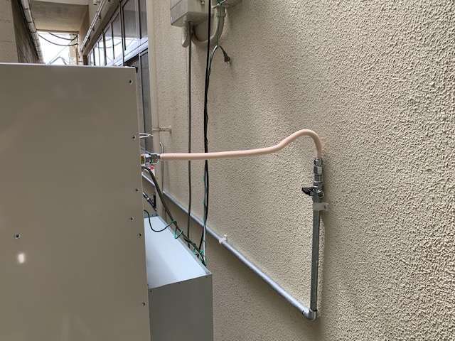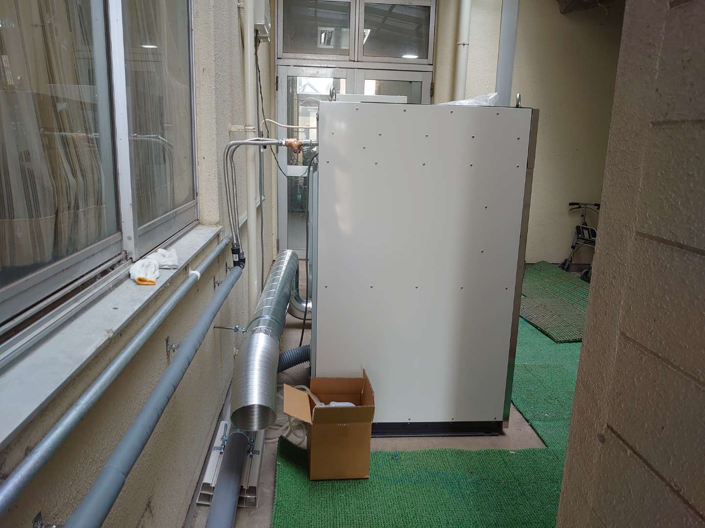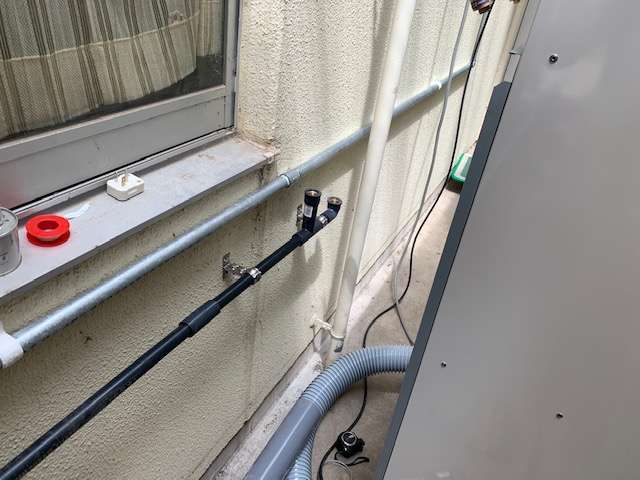排気筒を屋外に排出しないといけないので、排気筒の下り勾配を取るのに排気筒吊バンドを使用。給液ホースを用いて洗剤をポンプに接続。試運転で異状がないか確認、芝生マットを敷いて作業は終了です٩(ˊᗜˋ*)و
