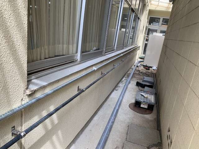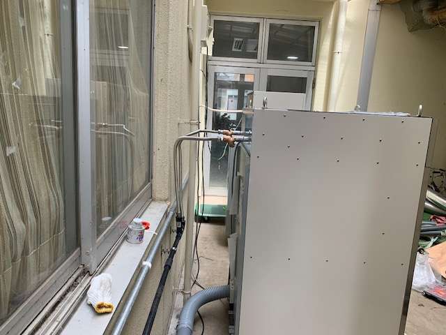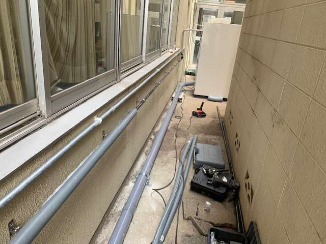 ガス乾燥機から!新設なので何もない状態からの施工です(^o^)/機器据付後、ガスを導く主管を壁に這わしていき٩(ˊᗜˋ*)و