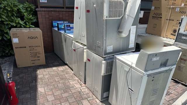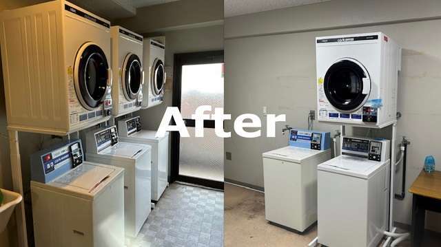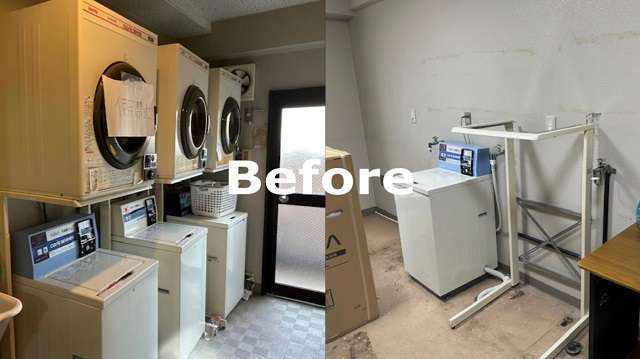 マンション共用ランドリー、いざという時に便利であることから単身や学生にはとてもありがたい設備です。オーナー様によっては使用金額を安く設定しているところもあるため水道代や電気代が節約できる面でリーズナブルに使用できる、ガス乾燥機が設置してあるところは利用者の方から一番喜ばれる機器です。今回作業を実施してきたのはコイン式洗濯機×3台とコイン式乾燥機×4台の撤去に併せての設置、兵庫県西宮市の女性専用マンションです。